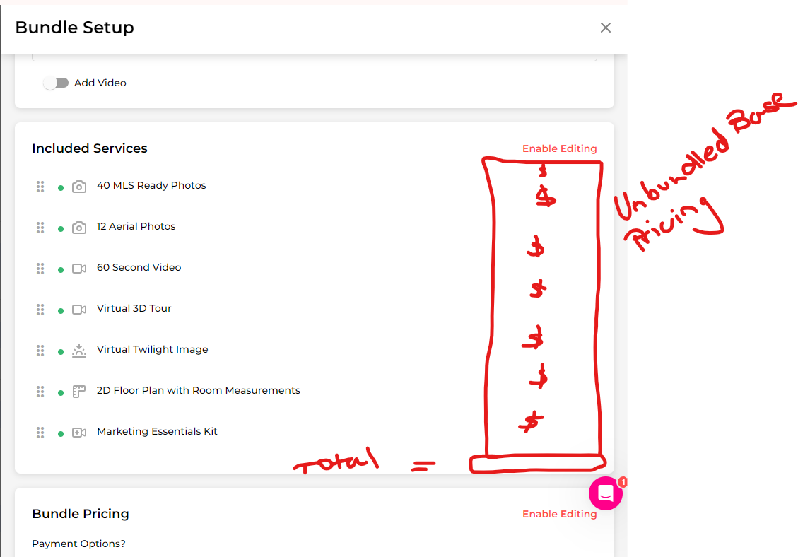 It would be nice to see while in the Bundle Set Up it will show the unbundled base price for the service item as its added to the bundle in grey on the right and a subtotal in that section so when entering a total price or price by SqFt it is easier to come up with pricing.